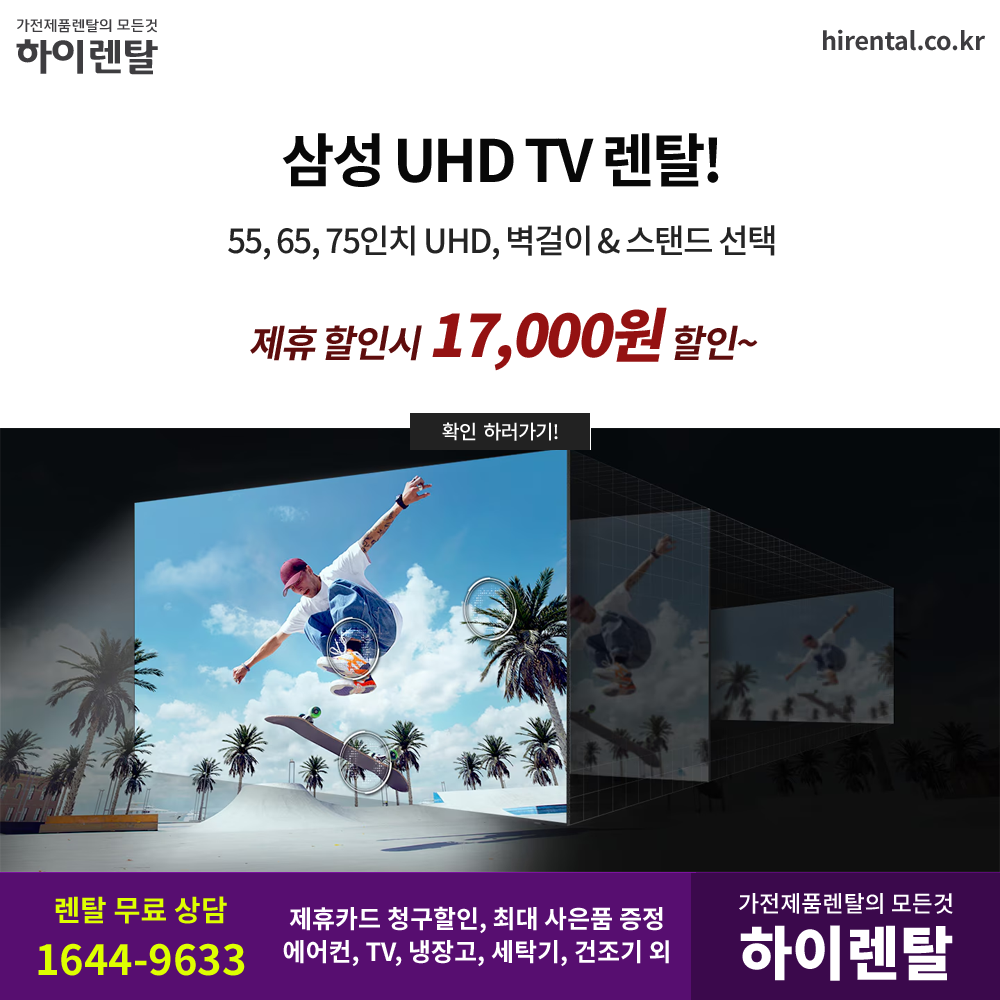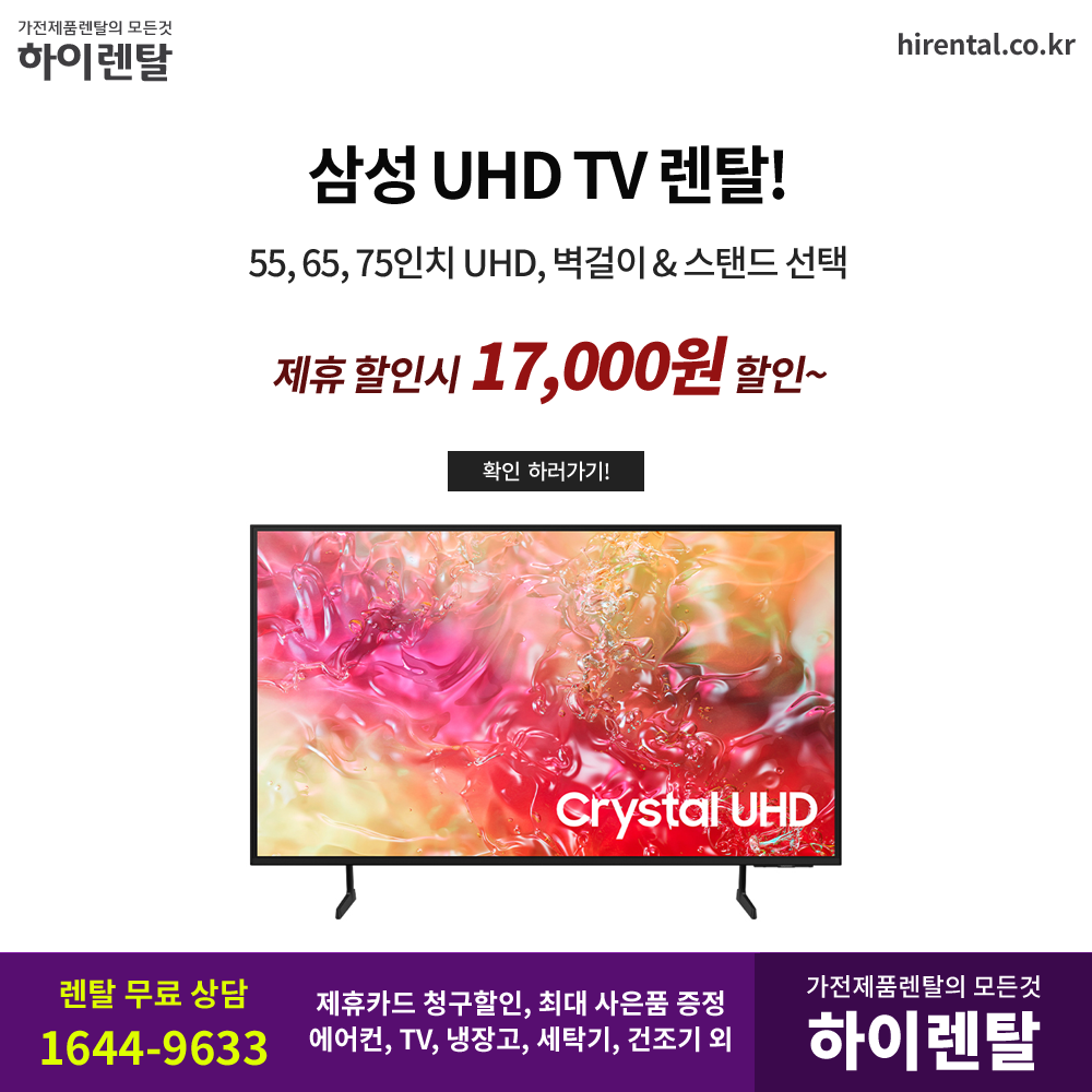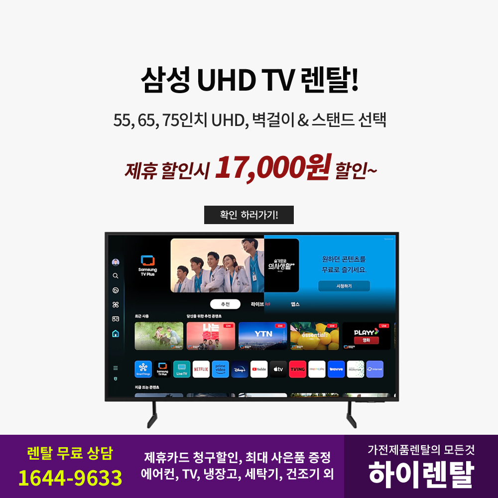 #삼성UHDTV #티비렌탈 #3일빠른배송 #4K업스케일링 #크리스탈프로세서4K #KU65UD7050FXKR #KU55UD7050FXKR #KU75UD7050FXKR #벽걸이형 #스탠드설치 #폐가전수거 #3년무상AS #제휴카드할인 #현금지원