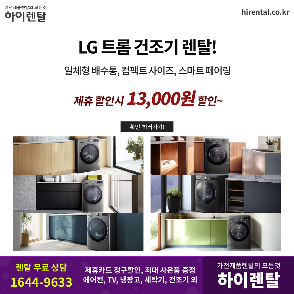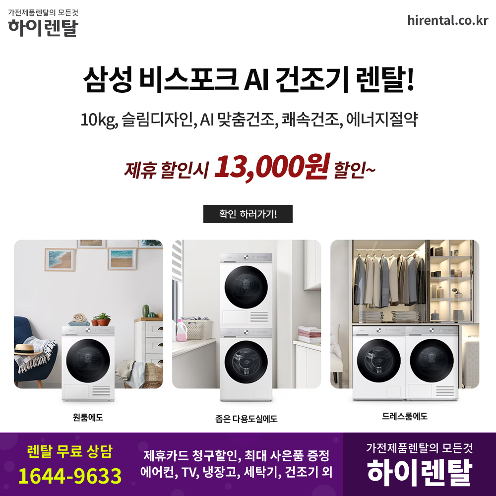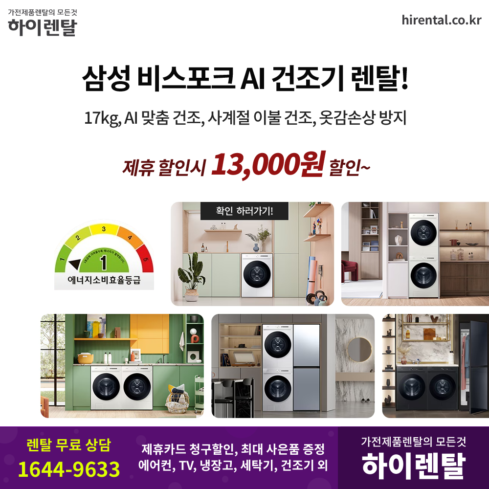 #드럼건조기 #삼성비스포크 #그랑데AI #LG트롬 #엘지오브제컬렉션 #냄새탈취 #먼지날림 #유해세균 #바이러스제거 #살균건조 #가사일축소 #제휴사할인 #하이렌탈 #현금지원