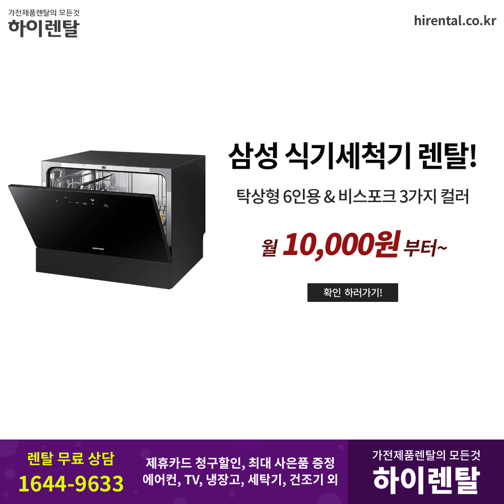 #삼성식기세척기 #식기세척기6인용 #컴팩트형 #상하날개 #고온직수 #강력세척 #세균살균 #다양한모드 #통살균코스 #프라이팬 #큰냄비 #세척가능 #자동문열림 #삼성가전 #제휴카드할인